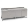 MASĂ-DULAP CU CHIUVETĂ 1500x600x850 mm -STMV-1S-2DR-3S- Mesele din inox cu dulap sunt folosite ca suprafețe de lucru în bucătărie, de asemenea pentru depozitarea vaselor, ustensilelor de bucătărie sau a produselor alimentare într-un spațiu protejat. Masa și carcasa cu uși sunt realizate din inox. Picioarele sunt reglabile în înălțime. Pe interior, blatul este consolidat cu o foaie de PAL. Chiuveta este realizată într-o versiune sudată.